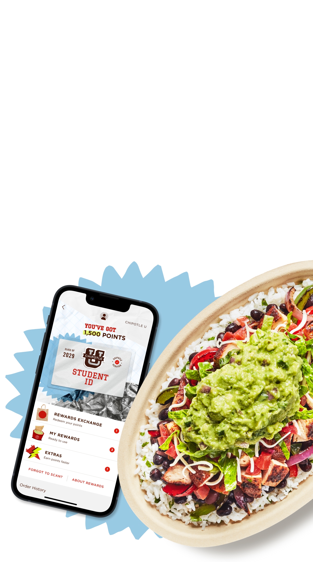 We use a third-party partner, ID.me, to verify that you are an actively enrolled student. Once verified with ID.me, you are automatically enrolled in Chipotle U Rewards.
